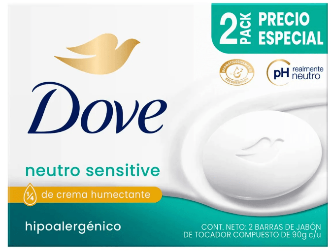 Barra limpiadora hipoalergénica y sin perfume. Limpia suavemente sin eliminar los aceites naturales de la piel. Precio aproximado: $30.00 pesos mexicanos por barra de jabón, se consigue en supermercados, Amazon mx, Mercado Libre.