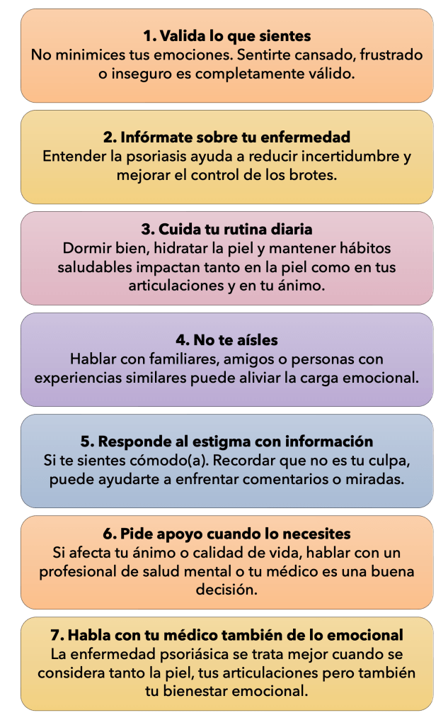 Muchas personas con psoriasis experimentan momentos de estrés, tristeza o frustración, especialmente cuando los síntomas aparecen en etapas importantes de la vida, afectan el sueño o interfieren con las actividades cotidianas. A esto se puede sumar la preocupación por la apariencia de la piel o por cómo reaccionarán otras personas.